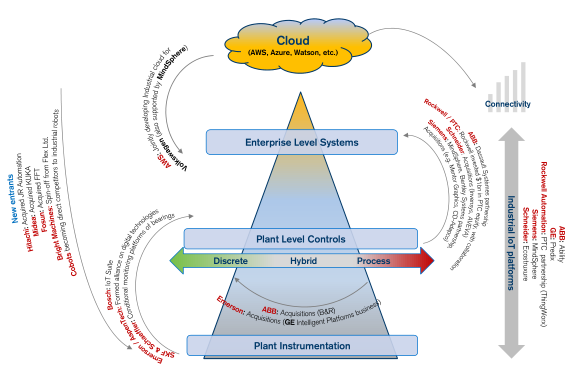2. Industrial IoT Platforms – the arms race continues with now >500 offerings by traditional automation, software and tech players, but also evidence of consolidation (GE Predix, Rockwell FactoryTalk) and leadership emerging (AWS, Microsoft, Siemens MindSphere); closing the machine-to-machine loop is the ultimate goal.